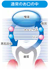 歯は、唾液やプラーク(歯垢)との間で、カルシウムの溶け出し(=脱灰)と取り込み(=再石灰化)を繰り返しています。