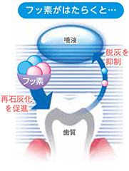 フッ素には、この再石灰化を促進して歯質を強化し、一方、酸の生産を抑制することで脱灰を制御して虫歯を予防する効果が有ります。