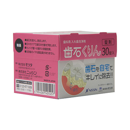 洗浄後いれ歯に洗浄剤の成分が沈殿・付着します。人体には無害ですがブラシなどを用いて流水でよくすすいでください。