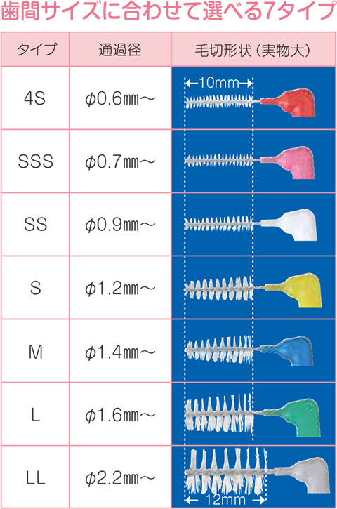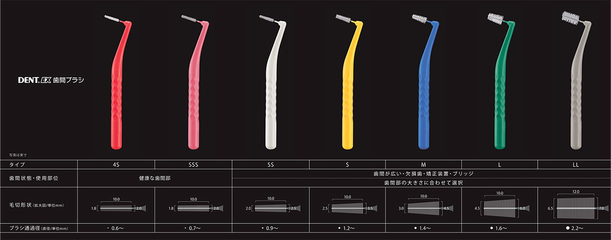 4SからLLまで7サイズの豊富なラインナップであらゆる歯間に対応します。