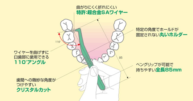 超合金SAワイヤー採用で折れにくく、110°アングルと85mmホルダーが高い操作性を確保、確実なプラークコントロールを実現します。