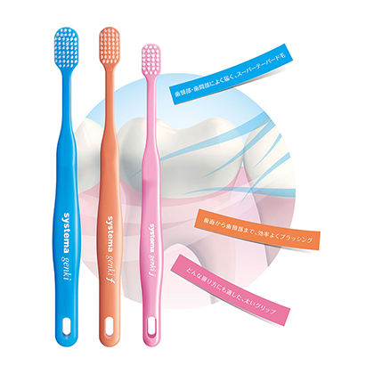 システマゲンキは接触面積が広く磨き残しが少なくなる幅広ヘッドと、歯肉に優しいソフトなスーパーテーパード毛を備えた幅広ヘッドで幅14.4mmのシステマゲンキ・12.2mmのげんき「f」忙しい朝でも磨き残しを撃退! そして「j」は混合歯列期の9歳くらいから若年層世代へ