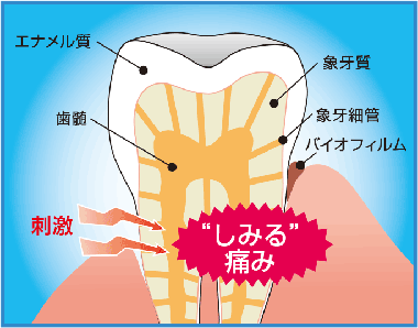 黄色い部分(象牙細管)から神経に刺激が伝わるから