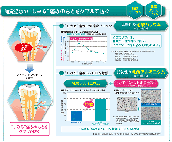 乳酸アルミニウム:露出した象牙細管を封鎖し、持続的に痛みの伝達経路を封鎖 ⇒ 飲食時の痛みまでケア
