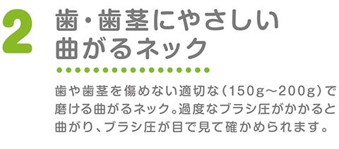 - 歯や歯ぐきを傷めない適切な(150〜200g)で磨ける曲がるネック。