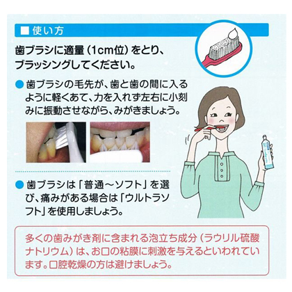 歯ブラシに適量(1cm位)をとり、ブラッシングして下さい。