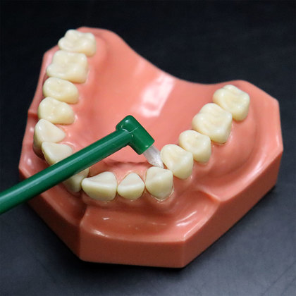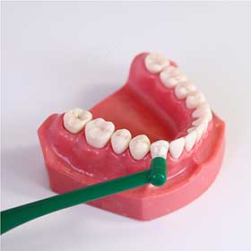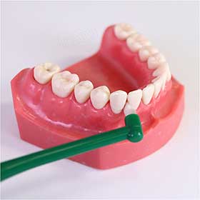 ブラシの先を歯間部の付け根(歯間乳頭部)等に軽く当て円を描くように細かくクルクル回転。