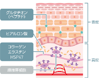 これらのコラーゲン、エラスチンの働きをよくするためのヒートショックプロテイン(HSP47やHSP70)の産生も増やす特徴があります。加えて、ヒアルロン酸の産生も高める作用が確認されております。