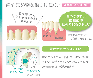 歯面や修復物にやさしい「研磨剤・清掃剤フリー」で、電動歯ブラシにもご使用いただけます。