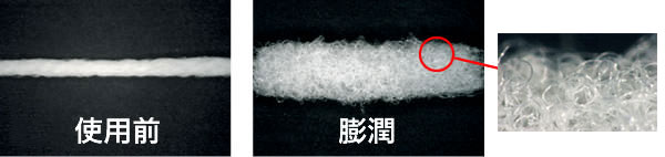 直径20μmので三次元ループ構造の繊維が唾液に触れると4倍のスポンジ状にふくらみます。